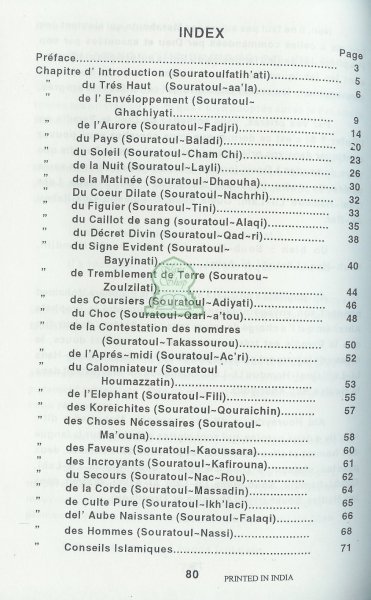 Si j’ai écrit cette partie dans le sens propre et traduit en français depuis le chapitre « Le Très Haut» jusqu’à lui des « Hommes », c’est que j’ai eu de la chance de rencontrer dans mon pays natale et même dans une grande partie de l’Afrique bien des Musulmans qui éprouvent l’amertume de l’ignorance de l’arabe. Ils ont le souci de connaître le Bon Dieu cependant même qu’ils n’ont été dans aucune classe coranique. C’est dans le but de leur rendre facile la compréhension que j’ai écrit les chapitres en arabe, traduit en française. Ce qui permet à cette masse la connaissance du Créateur et de savoir quel chemin suivre pour plaire à Dieu.