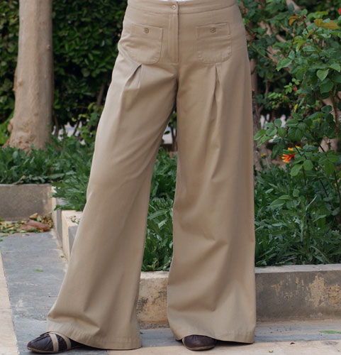 Description: full length; waistband; zip fly and button; 2 front patch pockets with button; released pleat starting from bottom of each pocket; wide leg fit. Imported.