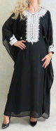 Abaya noire accompagnée de broderies, de strass et de bandes satinées sur toute la longueur ainsi que sur les extrémités des manches.Foulard assorti.