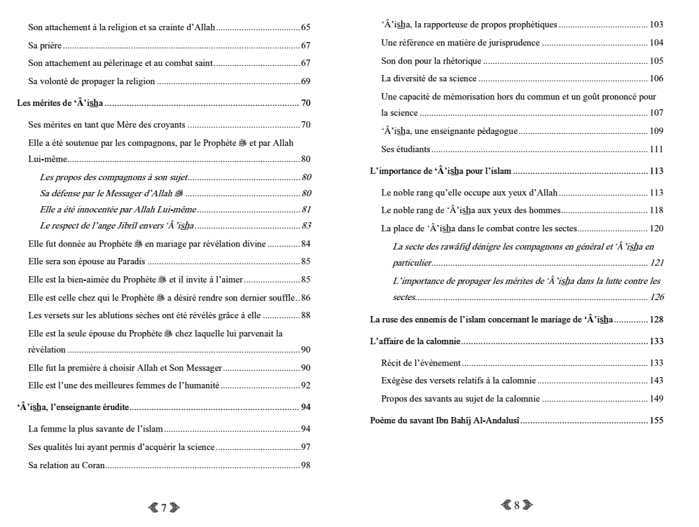 Ce livre décrit aussi son environnement familial,sa vie conjugale auprès du meilleur des hommes, le Messager d’Allah‹. Il dresse également le portrait complet de ‘Â’isha, la femme la plus érudite et la meilleure enseignante qu’ait connue notre communauté.Sont évoqués également son caractère, ses savoirs,sa piété, ses mérites et sa vie religieuse.