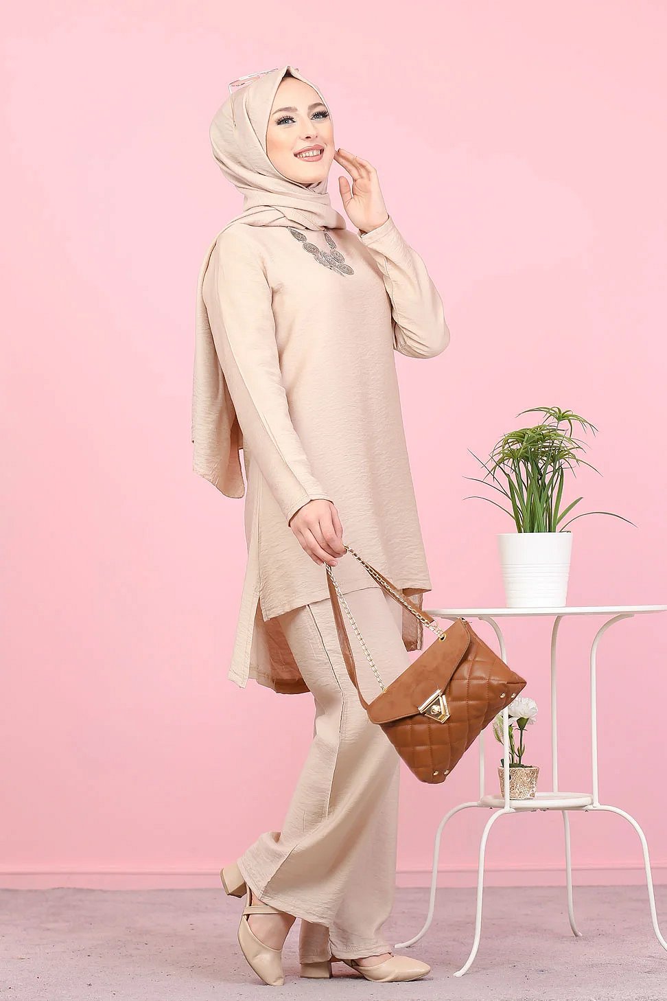 Ensemble tunique motif doré et pantalon pour femme (Tenue Hijab Turquie) - Couleur beige - REF. 36367 (39.90 €)