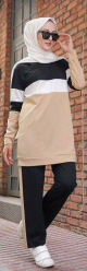 Ensemble sportwear (deux pièces pantalon et tunique tricolore) pour femme musulmane - Survêtement à 3 couleurs : camel, noir et blanc - REF. 32916 (24.90 €)