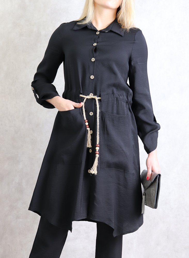 Tunique : mi longue, col chemise, manches ajustables, lien de serrage à la taille, grandes poches.
