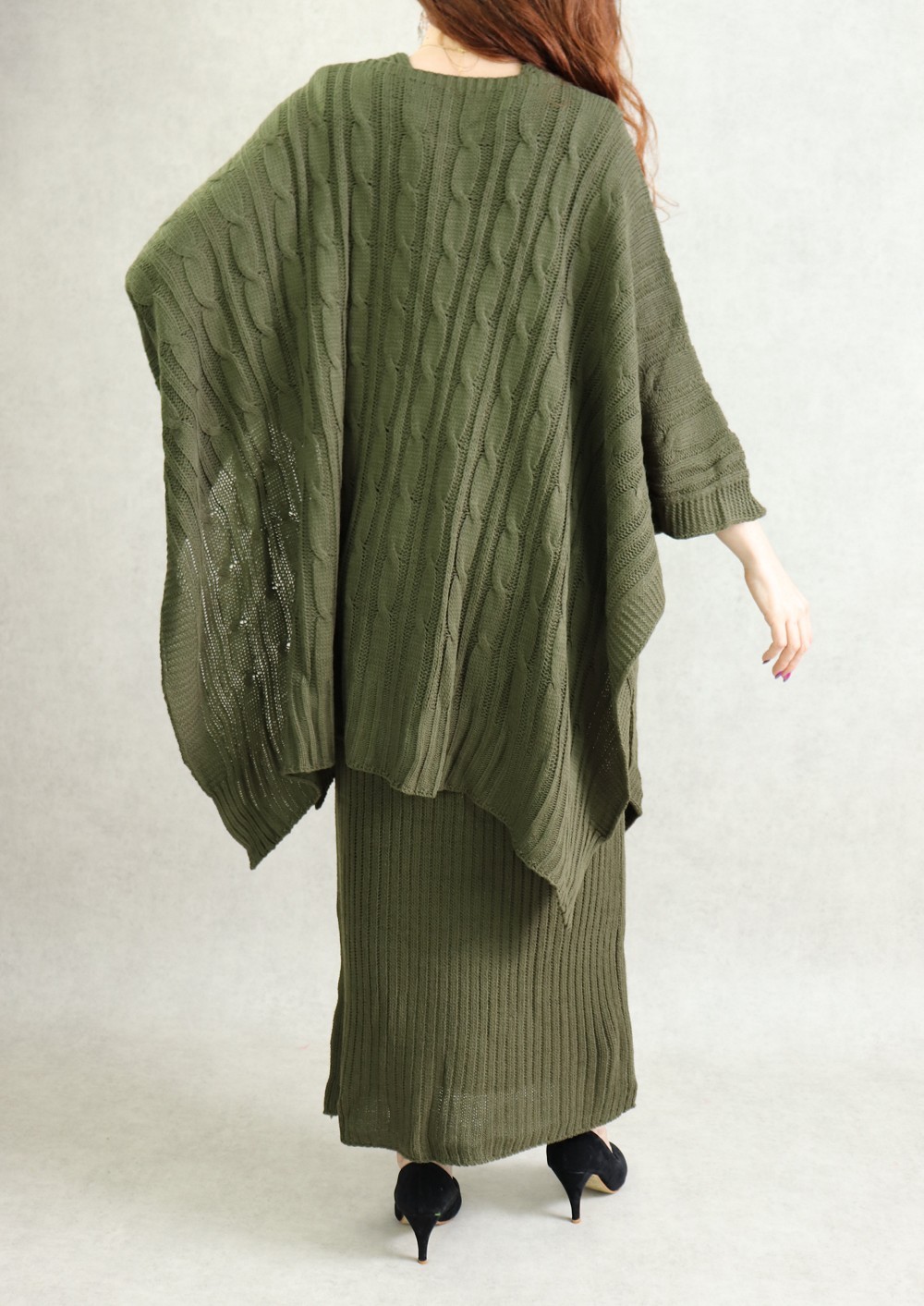 Ensemble robe débardeur, col en V, coupe droite, grosse maille + pull poncho, coupe large, boutons décoratifs au niveau des manches coupées, maille torsadée.
