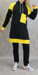 Ensemble survêtement pour femme, haut mi long, col rond, manches longues bouffante original en tissu lin. Pantalon coupe droite, taille élastique, modèle casual disponible dans différentes couleurs.