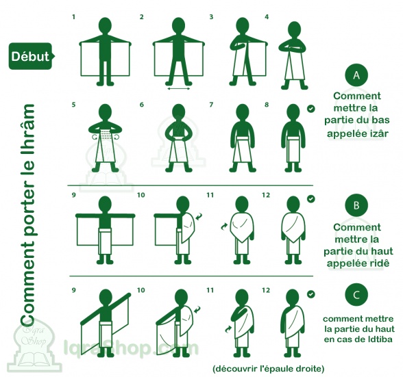 - Les hommes doivent porter un habit composé de deux pièces d'étoffe blanche, non cousues, dans lesquelles les pèlerins s'enroulent, en prenant soin de libérer l'épaule droite. De plus, leur tête et leur visage ne doivent pas être recouverts.