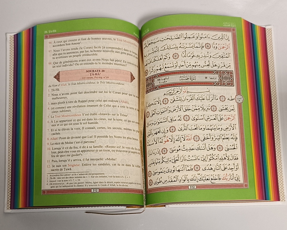 Dans ce magnifique Coran chaque partie (Jouz') est colorée avec une couleur différente, avec un dégradé de couleurs sous forme d'arc-en-ciel. Ce qui aide l'apprentissage et la révision du Saint Coran.