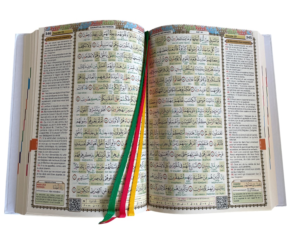 Les règles de tajwid sont données par un système de couleur intuitif pour apprendre les règles de lecture et de psalmodie du Saint Coran et le code QR (présent sur chaque page) permet d'ouvrir une vidéo sur son smartphone et d'écouter et suivre la lecture du Coran par cheikh Soudays.