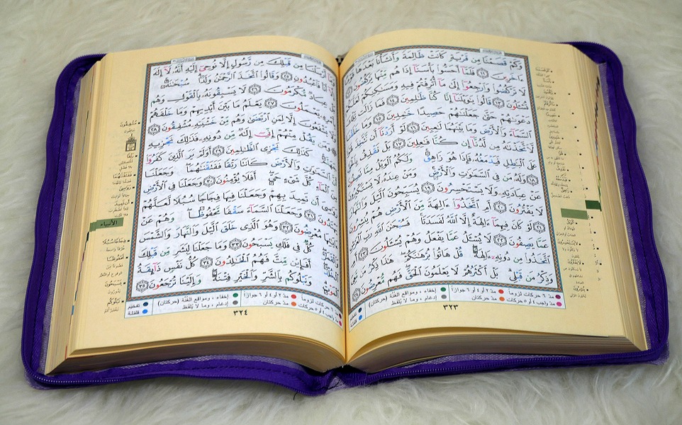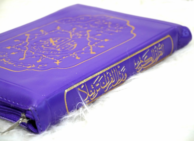 Le Saint Coran en version pochette à fermeture Zip de couleur Mauve avec règles de lecture en couleur (Ahkâm at-Tajwîd). Idéal pour emporter partout.