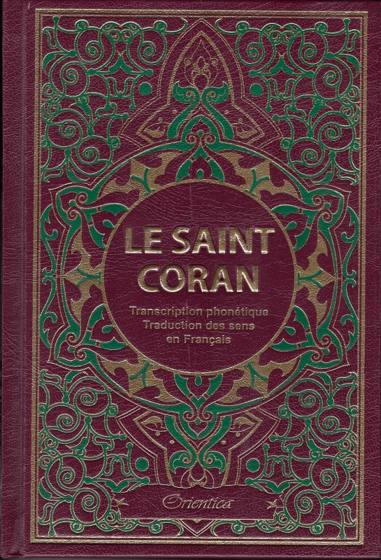 Le Saint Coran arabe bordeaux avec traduction en langue française du sens de ses versets et transcription phonétique avec arabesques vertes bordées de dorure Livre