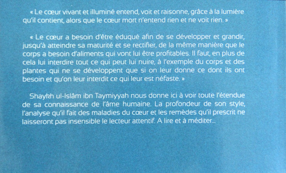 « Le cœur vivant et illuminé entend, voit et raisonne, grâce à la lumière qu’il contient, alors que le cœur mort n’entend rien et ne voit rien. »« Le cœur a besoin d’être éduqué afin de se développer et grandir, jusqu’à atteindre sa maturité et se rectifier, de la même manière que le corps a besoin d’aliments qui vont lui être profitables. Il faut, en plus de cela lui interdire tout ce qui peut lui nuire, à l’exemple du corps et des plantes qui ne se développent que si on leur donne ce dont ils ont besoin et qu’on leur interdit ce qui leur est néfaste. »Shaykh Al-Islâm ibn Taymiyyah démontre ici toute l’étendue de sa connaissance de l’âme humaine. La profondeur de son style, l’analyse qu’il fait des maladies du cœur et les remèdes dont il nous fait part ne laisseront pas insensible le lecteur attentif. A lire et à méditer…Sommaire du livre :Les maladies du cœur et leurs remèdesLes maladies du corpsLes maladies du cœur ressemblent aux maladies du corpsLa mort du cœurLe Coran est un moyen de guérisonLa sincérité envers Allah dans la purification des âmesLa bénédiction de l’obéissance et la calamité du péchéLa rectitude du cœurLa parabole de la foi et de l’hypocrisieLes caractéristiques du cœurLe droit cheminLa pudeurLa jalousieLa différence entre l’envie et la concurrenceLes causes de la concurrenceLe mérite de la concurrence en religionLeçons à tirer de la sourate Yûsuf à propos de la jalousieLa patience du Prophète face aux persécutions des mécréantsLe remède à la jalousieLes maladies des désirs et des passions amoureusesL’amour d’Allah