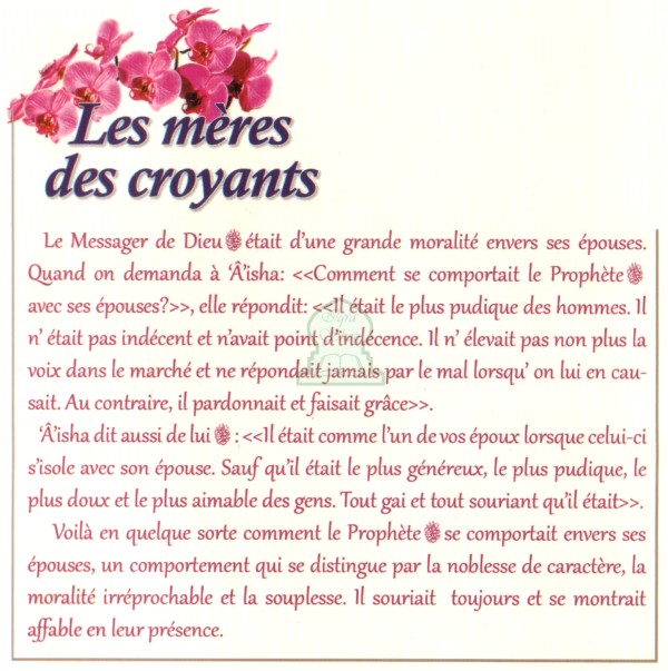 Les femme qui sont à prendre pour modèles sont sans aucun doute les mères des croyants : les épouses du Prophète -Prières et bénédictions d'Allah sur lui- . Elles sont nommées ainsi « Oummahatoul Mou-minine » (les mères des croyants) d’après la parole d’Allah -Le Très Haut- : " Le Prophète a plus de droit sur les croyants qu’ils n’en ont sur eux-mêmes, et ses épouses (au prophète) sont leurs mères (aux croyants) " S33 V6.
