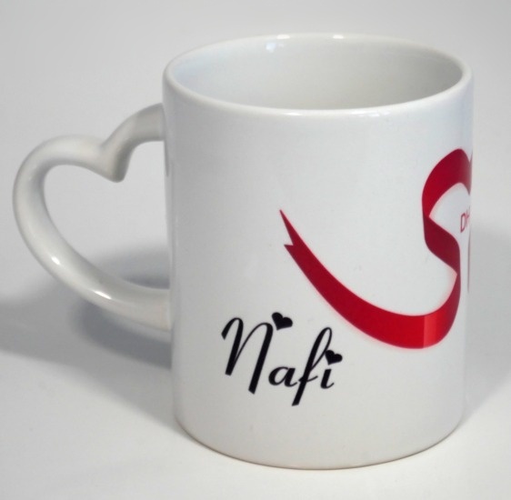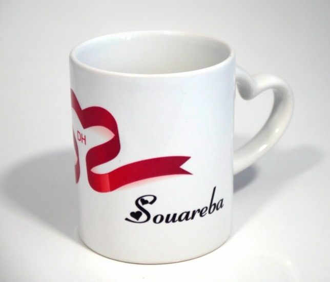 Tasse blanche avec anse en forme de coeur à personnaliser avec un ou deux prénoms/messages (à gauche et à droite du coeur). Vous pouvez choisir la forme du coeur et la couleur d'écriture des prénoms/messages.