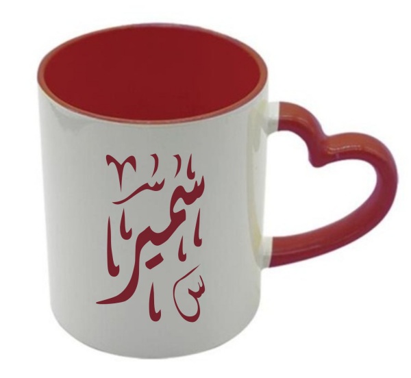 Profitez de recevoir cette tasse avec anse (poignée sous forme de coeur et intérieur couleur bordeaux) avec l'inscription du prénom calligraphié en arabe et/ou en français ou un message en français. S'il s'agit d'un prénom, vous pouvez choisir un style parmi les quatre (voir image ci-dessous).