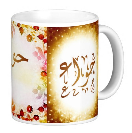 Mug avec le prénom "Awa" écrit en français, en arabe (حواء) et calligraphié de façon artistique en arabe sur la partie droite.