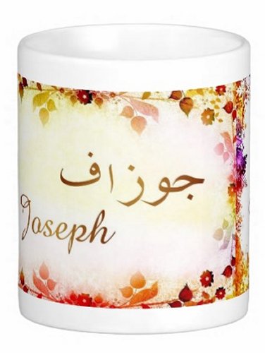 Mug avec le prénom "Joseph" écrit en français, en arabe (جوزاف) et calligraphié de façon artistique en arabe sur la partie droite.
