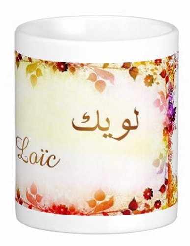 Mug avec le prénom "Loïc" écrit en français, en arabe (لويك) et calligraphié de façon artistique en arabe sur la partie droite.
