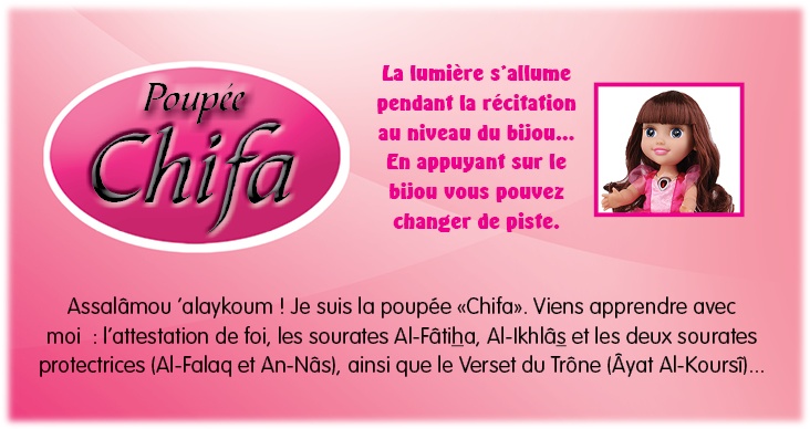 Assalâmou ‘alaykoum ! Je suis la poupée “Chifa”. Viens apprendre avec moi : l’attestation de foi, les sourates Al-Fâtiha, Al-Ikhlass et les deux sourates protectrices (Al-Falaq et An-Nâs), ainsi que le verset du Trône (Ayat Al-Koursî)...