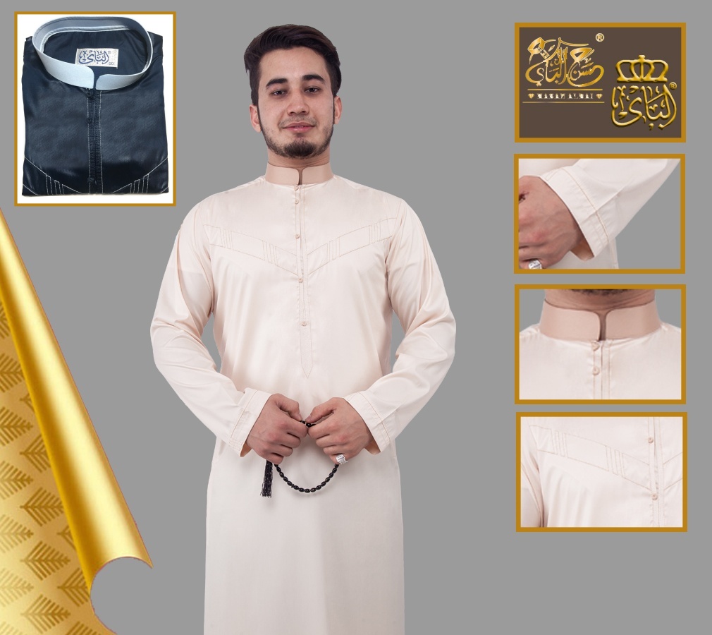 Qamis long manches longues ouverture boutons au niveau de la poitrine. Tissu de qualité supérieure, fluide et très agréable, légèrement satiné, adapté à toutes les saisons. Très bonnes coutures et finitions. Deux grandes poches latérales avec sous-poches internes (pour clés ou petits objets). Le col maho est d'une couleur légèrement plus foncée.