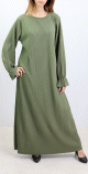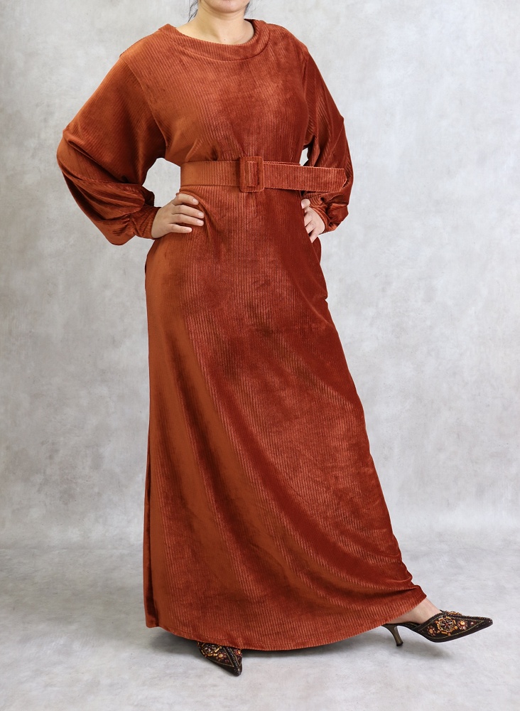Robe longue, col dégagé, ceinture assortie ajustable, poches latérales, tissu épais et doux, effet velours côtelé, coupe droite.