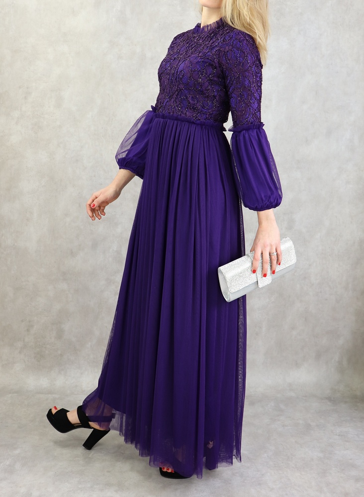 Robe longue, col rond orné d'une collerette, manches finition élastique aux poignets, fermeture à glissière dans le dos, entièrement doublée, broderies sur le buste et une partie des manches, tulle sur tout le reste de la robe.