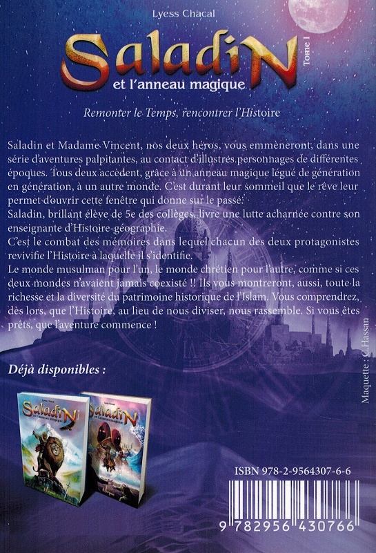 Tous deux accèdent, grâce à un anneau magique légué de génération en génération, à un autre monde. C’est durant leur sommeil que le rêve leur permet d’ouvrir cette fenêtre qui donne sur le passé. Saladin, brillant élève de 5e des collèges, livre une lutte acharnée contre son enseignante d’Histoire-géographie. C’est le combat des mémoires dans lequel chacun des deux protagonistes revivifie l’Histoire à laquelle il s’identifie. Le monde musulman pour l’un, le monde chrétien pour l’autre, comme si ces deux mondes n’avaient jamais coexisté !! Ils vous montreront, aussi, toute la richesse et la diversité du patrimoine historique de l’Islam. Vous comprendrez, dès lors, que l’Histoire, au lieu de nous diviser, nous rassemble. Si vous êtes prêts, que l’aventure commence !