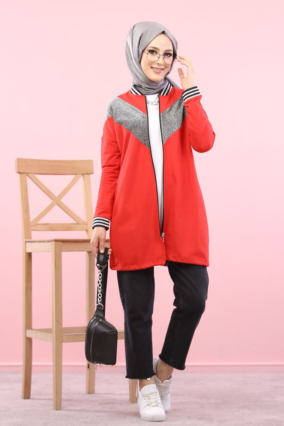 Veste argentee pour femme - Tunique zippee style sportswear (Mode Musulmane) - Couleur rouge