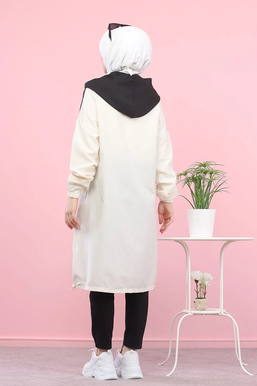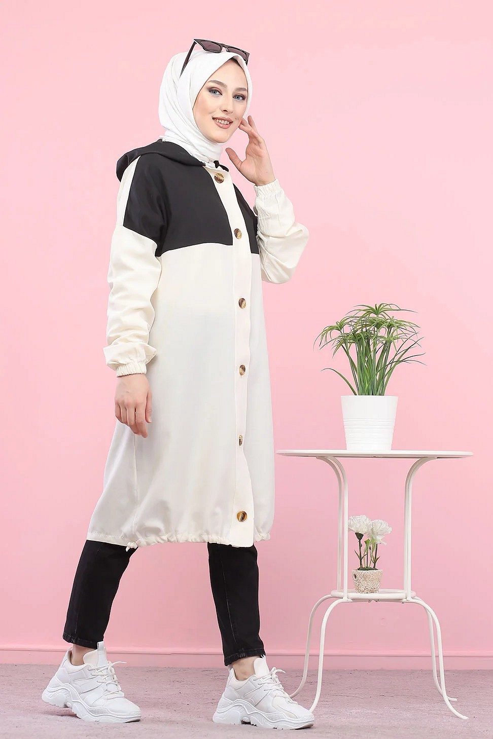 Veste mi longue, capuche, fermeture boutons sur toute la longueur, manches finition élastique, liens de serrage à la base. Coupe droite, tissu effet tissé aspect lin.