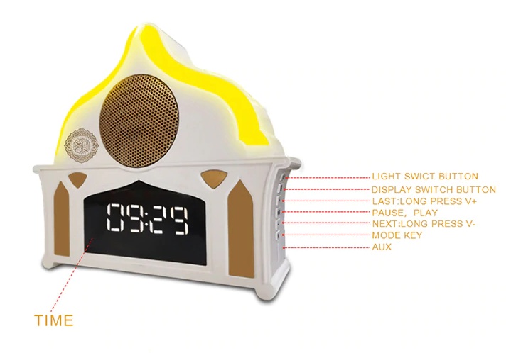 Lampe Veilleuse Coranique + horloge LED numérique avec Haut-parleurs, Bluetooth traduction sous forme de mosquée avec télécommande (SQ-912) Produit electronique