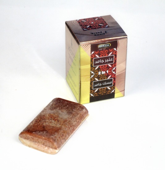 Carré de parfum solide 2 en 1 (musc et ambre jamid) qui a été confectionné à partir d'huiles essentielles.