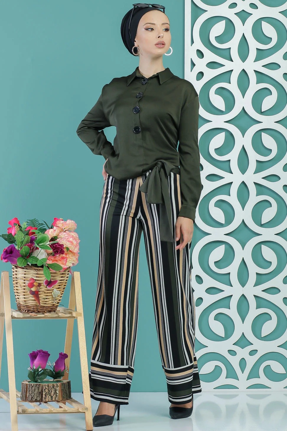 Pantalon femme à rayures blanches, noires, beiges et kakis avec ceinture couleur kaki Vetement & Accessoire