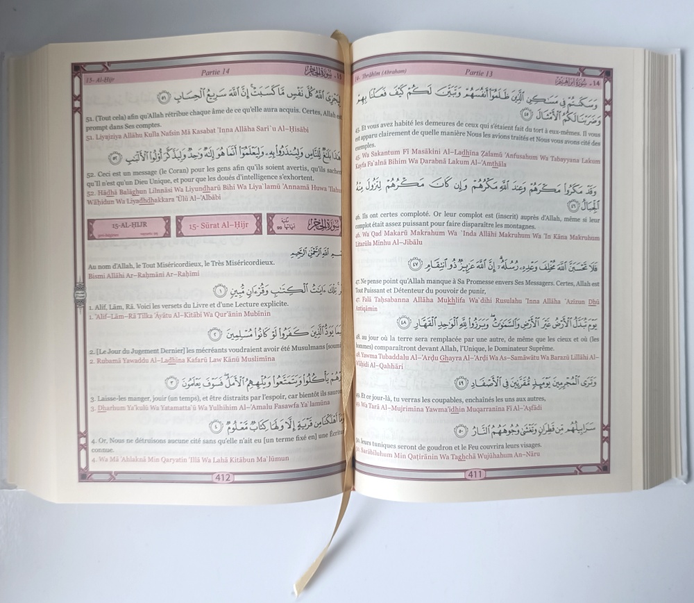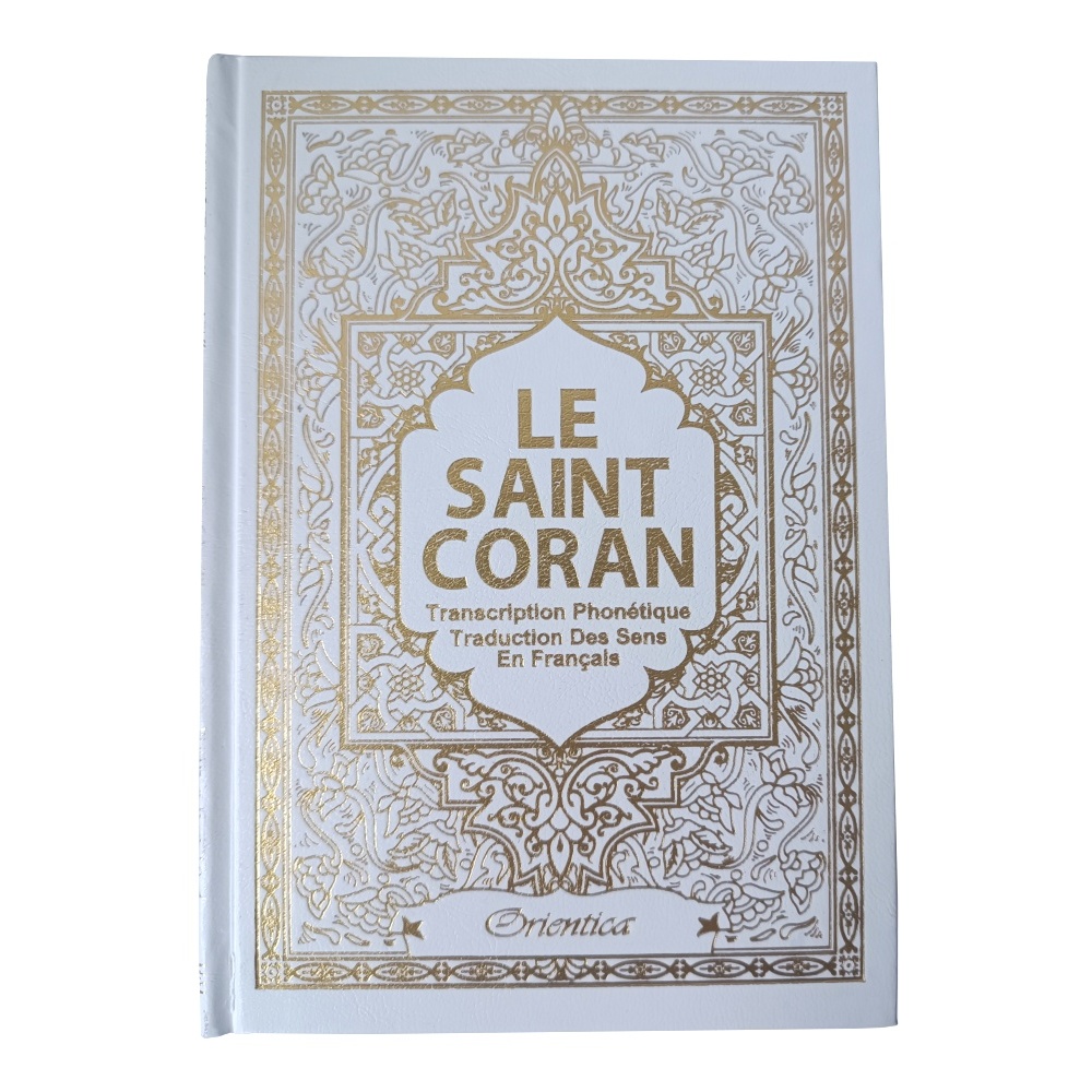 Le saint Coran avec versets en arabe, traduction française + transcription phonétique (translittération de l'arabe en caractères latins). Impression couleur, avec marque page intégré.