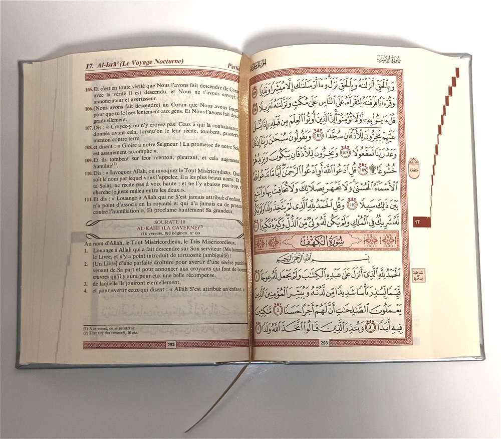 Avec index des sourates visible sur la tranche du livre permettant un accès plus rapide au début de chaque sourate. Pour les sourates longues, permet de connaître visuellement le nombre de pages qu'il nous reste à lire pour finir la sourate.
